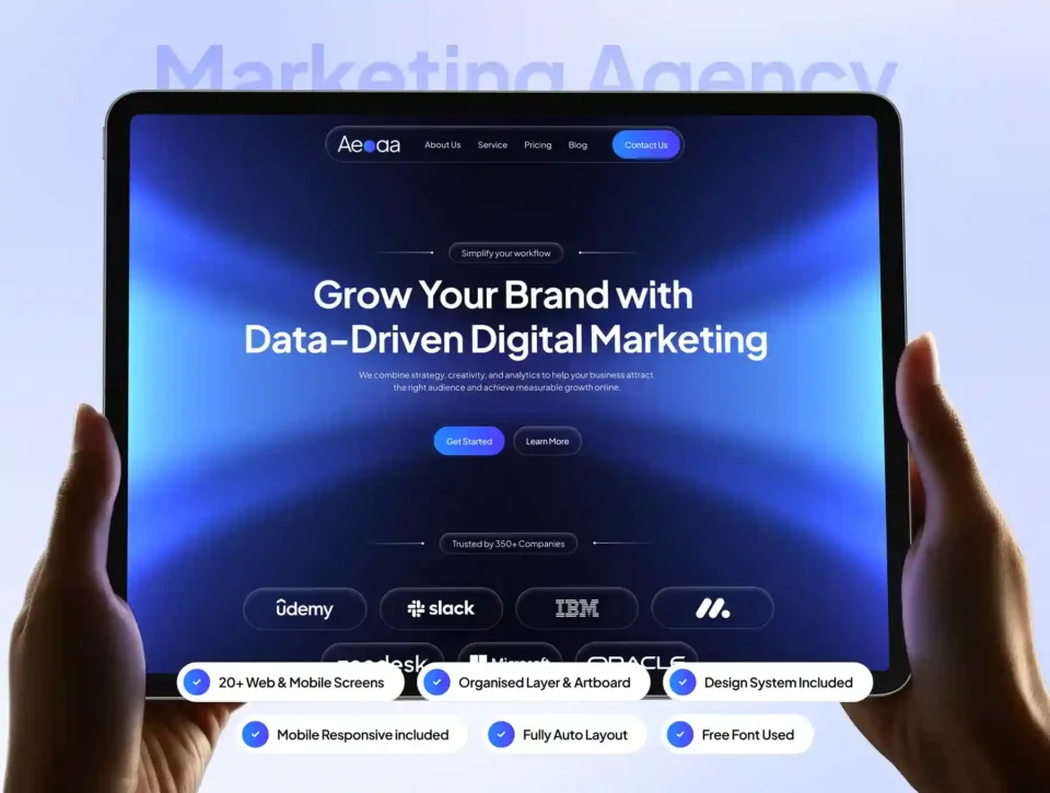 Aeoa – Marketing Agency Website UI Kit featuring over 20+ meticulously designed web and mobile screens, crafted to elevate your marketing agency’s online presence. This comprehensive collection streamlines your design process while delivering a seamless, engaging experience for your audience.