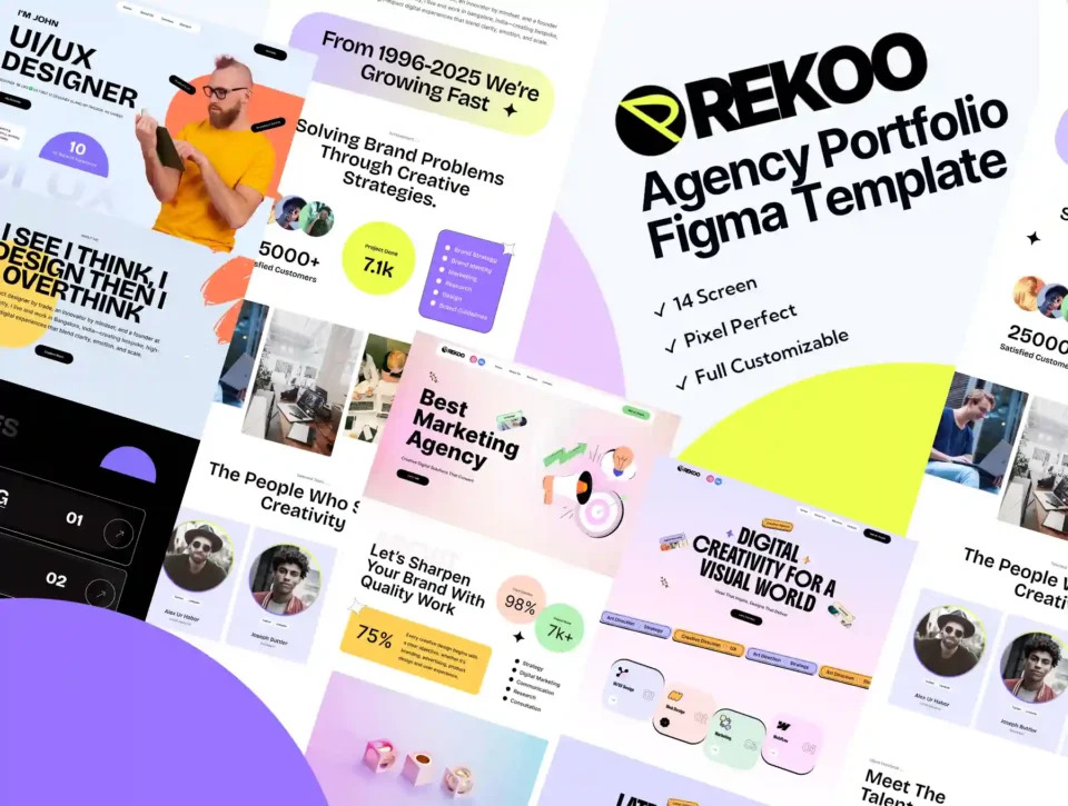 Rekoo is an amazing Figma designed template for all Portfolio, Creative Agency Portfolio, Digital Agency, Marketing Agency, Design Agency, Startup Agency and Other Portfolio related Company. 14 Figma Artboard Template suitable for various Portfolio business . Empowering you with the flexibility to mix and match elements . Rekoo comes with modern ui /ux and unique design.