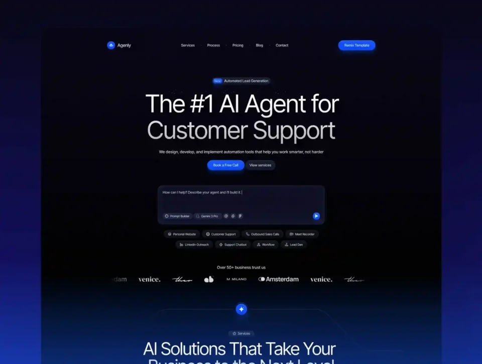 Agenly is a modern AI agency template crafted for AI agencies, SaaS founders, and ambitious tech startups. Built to showcase AI agents, conversational interfaces, and real-world use cases, it delivers a sleek, fully responsive, conversion-focused experience from the first scroll.