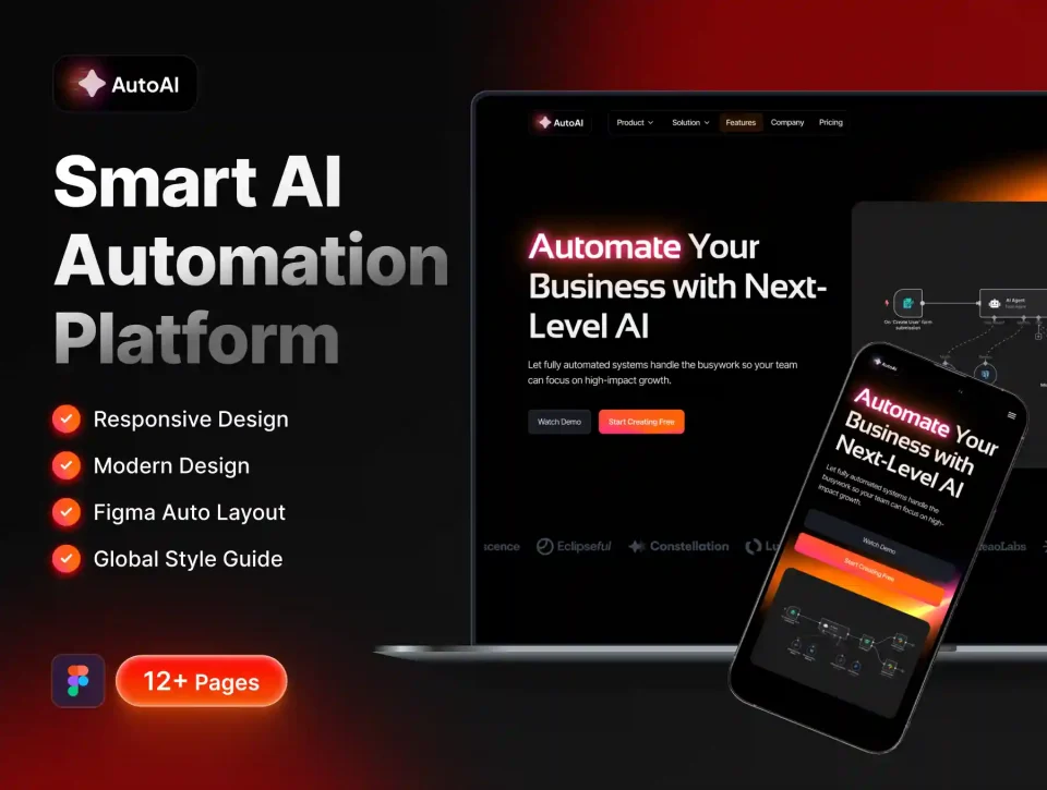 AI Automation Platform UI Kit is a modern, dark-mode design system built for AI-powered SaaS products, workflow automation tools, and no-code platforms. The UI is crafted to help startups and businesses present complex automation flows, integrations, and dashboards in a clear, high-impact way.