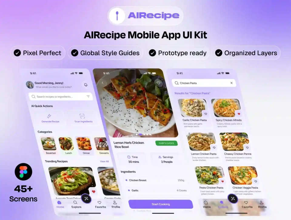 This UI kit includes a complete AI recipe journey from onboarding and ingredient input to AI-generated recipes, cooking steps, favorites, and meal planning. The design focuses on a clean layout, engaging visuals, and a user-friendly experience tailored for food lovers.