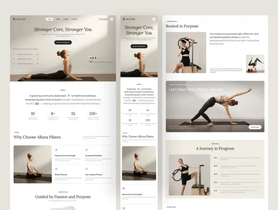Create a calm, intentional, and inspiring online presence with Alluna, a Pilates Studio Website UI Figma Template crafted for modern wellness brands, studios, and mindful movement communities. Designed with a soft editorial aesthetic and a purpose-driven structure, Alluna helps communicate balance, strength, and clarity through a refined visual experience. Available in both desktop and mobile views, the template ensures visual harmony and smooth navigation across devices, guiding visitors naturally from first impression to confident action.