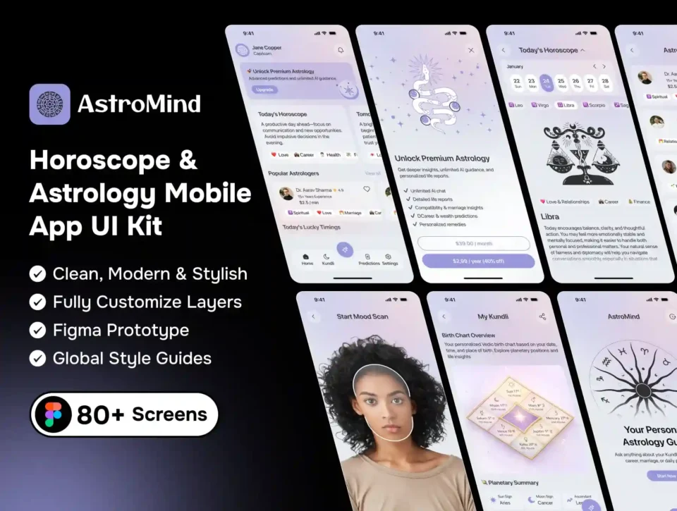 AstroMind blends celestial visuals, intuitive horoscope flows, and personalized astrology dashboards to create an engaging user journey. From daily horoscopes and birth chart analysis to compatibility insights and tarot readings, every screen is designed to feel mystical yet clean and easy to navigate.