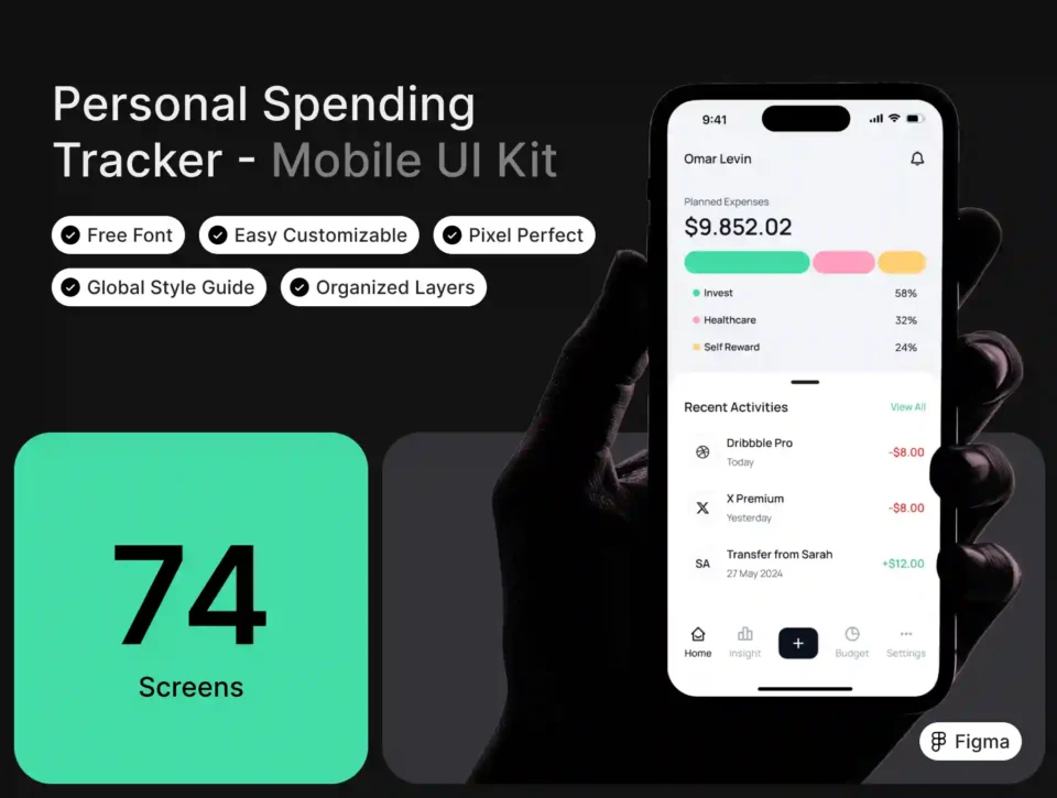 4. Easy Navigation: Each screen has a clear navigation bar at the bottom, allowing users to switch between Home, Insight, Budget, and Settings.