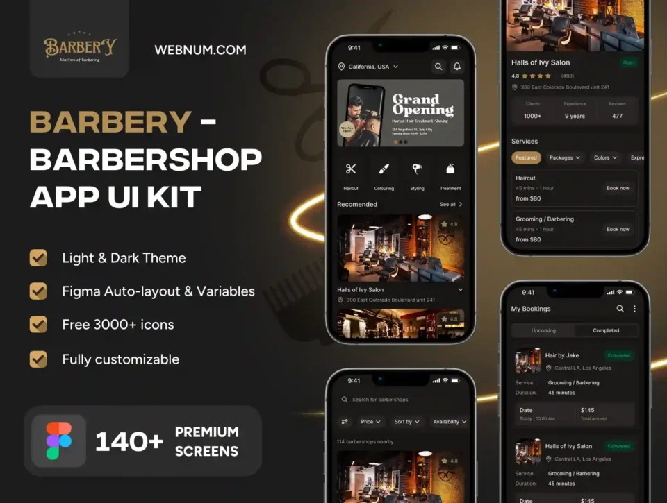 Barbery – Barbershop App UI Kit is a premium Figma design for building polished booking experiences for barbershops, salons, and grooming services. It combines a production-ready design system with 140+ meticulously organized screens, covering end-to-end flows: discover services, select professional, pick time, manage bookings, checkouts, profiles, reviews, chat, and more.