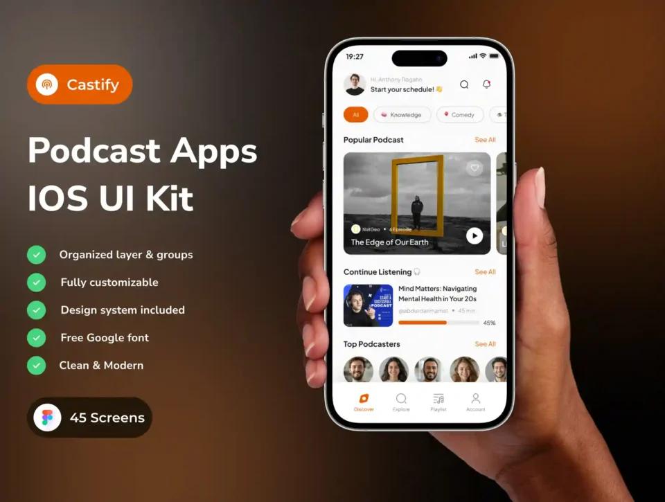 Castify is a modern and intuitive iOS UI kit crafted for building engaging podcast and audio streaming apps. Featuring 45 professionally designed screens, Castify helps creators and developers deliver a seamless, immersive listening experience with speed and consistency.
