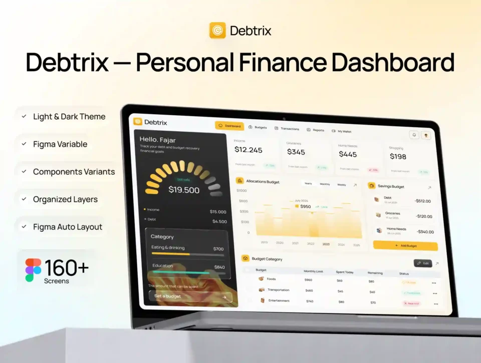 Built with Figma Variables, Auto Layout, and Component Variants, Debtrix provides a scalable design system that helps designers create fintech dashboards, budgeting tools, and finance management platforms faster.