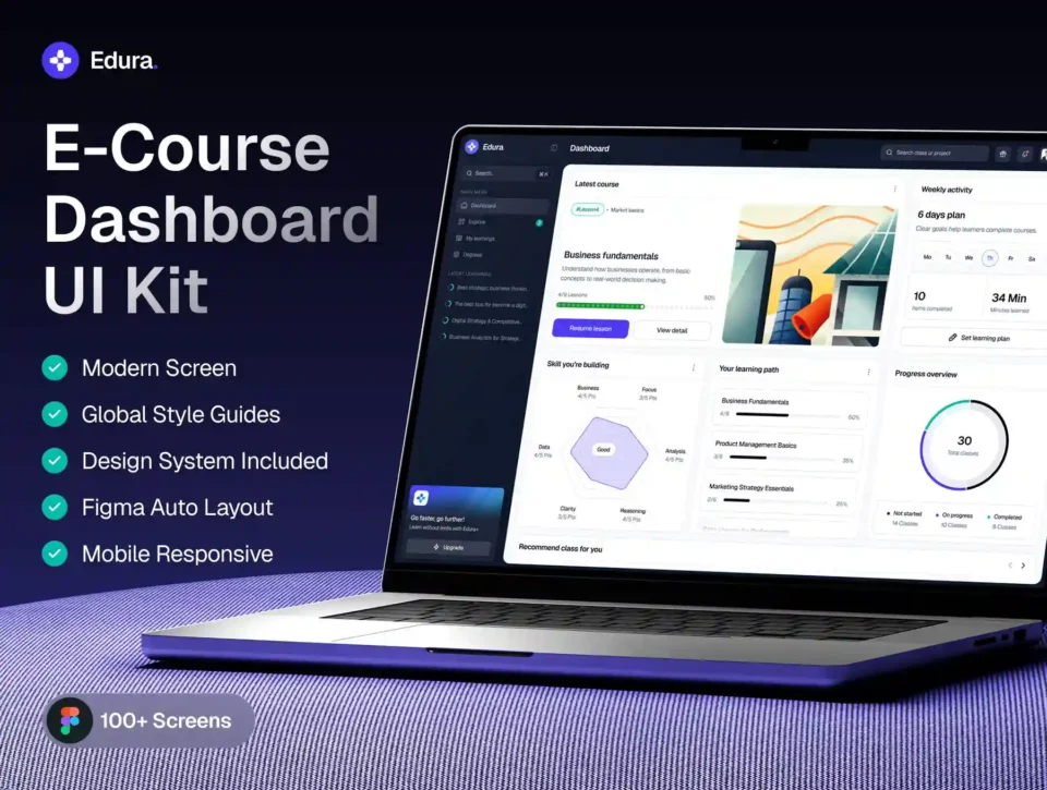 Edura – E-Course Dashboard UI Kit is a modern, clean, and well-structured dashboard UI kit designed for online learning platforms, e-course systems, and education-based SaaS products. Built to support both learners and administrators, Edura delivers a clear, engaging, and data-driven learning experience.