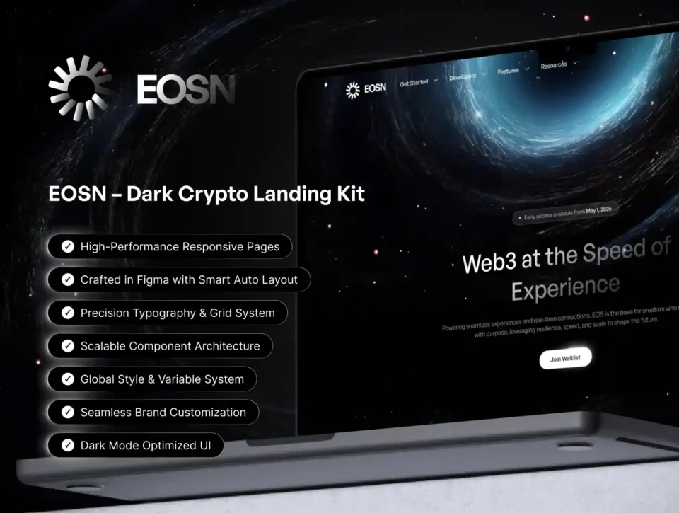 EOSN is a high-performance dark crypto landing page UI kit designed for Web3 startups, blockchain platforms, and fintech products that want to stand out.