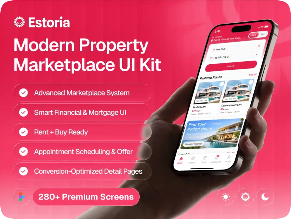 Estoria is a modern Property Marketplace Mobile UI Kit crafted to power next-generation property platforms. Designed with a premium, conversion-focused approach, Estoria delivers a complete ecosystem for both Rent and Buy experiences from property discovery to booking appointments, making offers, and negotiation flows.