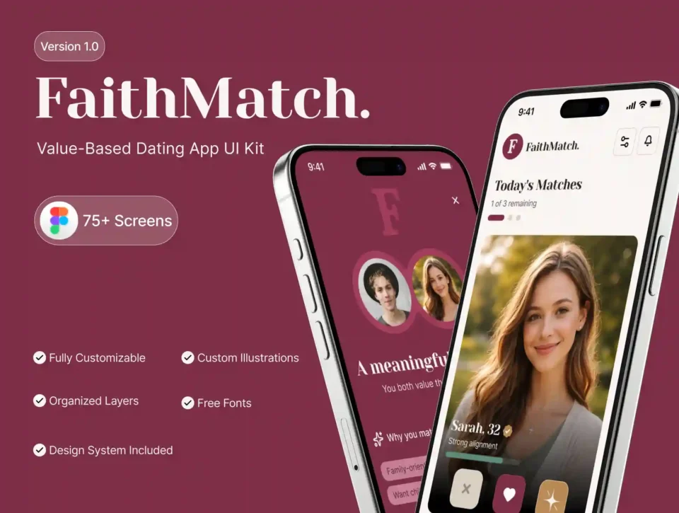 FaithMatch is a modern dating app mobile UI kit designed in Figma, featuring 75+ carefully crafted screens covering the entire user journey.