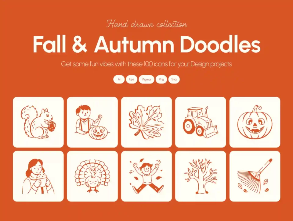 This fall and autumn doodle set brings the joy of the season right into your designs. Whether you’re crafting social media posts, seasonal invitations, cozy product or packaging, these hand drawn icons are a breeze to use. With a variety of file formats in multiple sizes, you’ll have everything you need for effortless integration into any creative project.