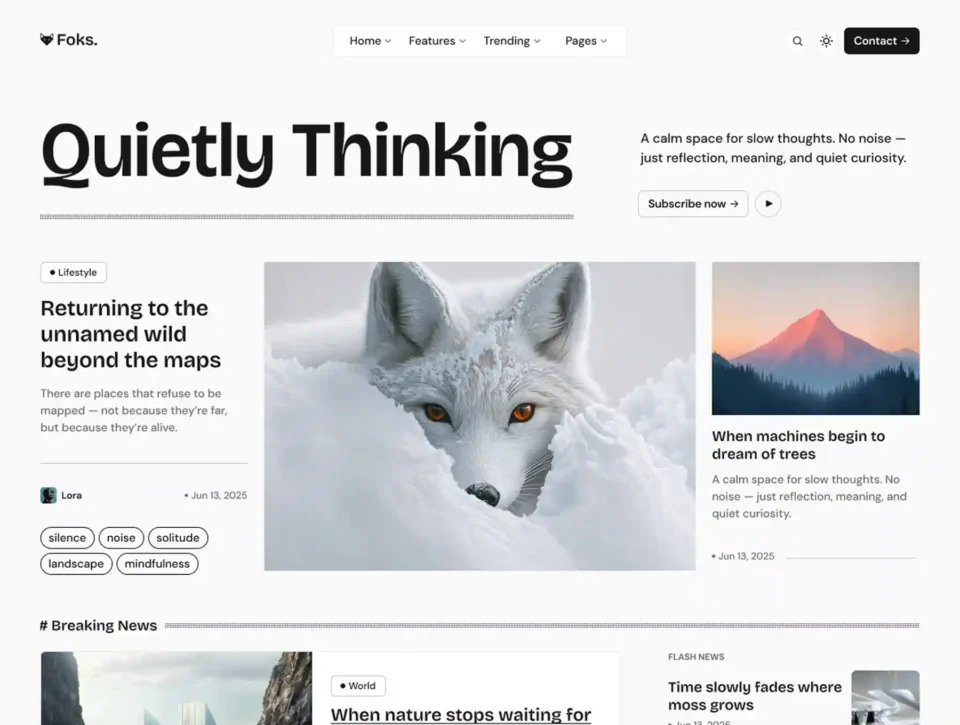 Foks is a sleek and lightweight NextJS template designed for bloggers, authors, editors, journalists, and anyone looking to share stories, thoughts, or articles online. With its clean minimalist layout and an intuitive, fully adaptable design system, Foks delivers a smooth, distraction-free reading experience from the very beginning.