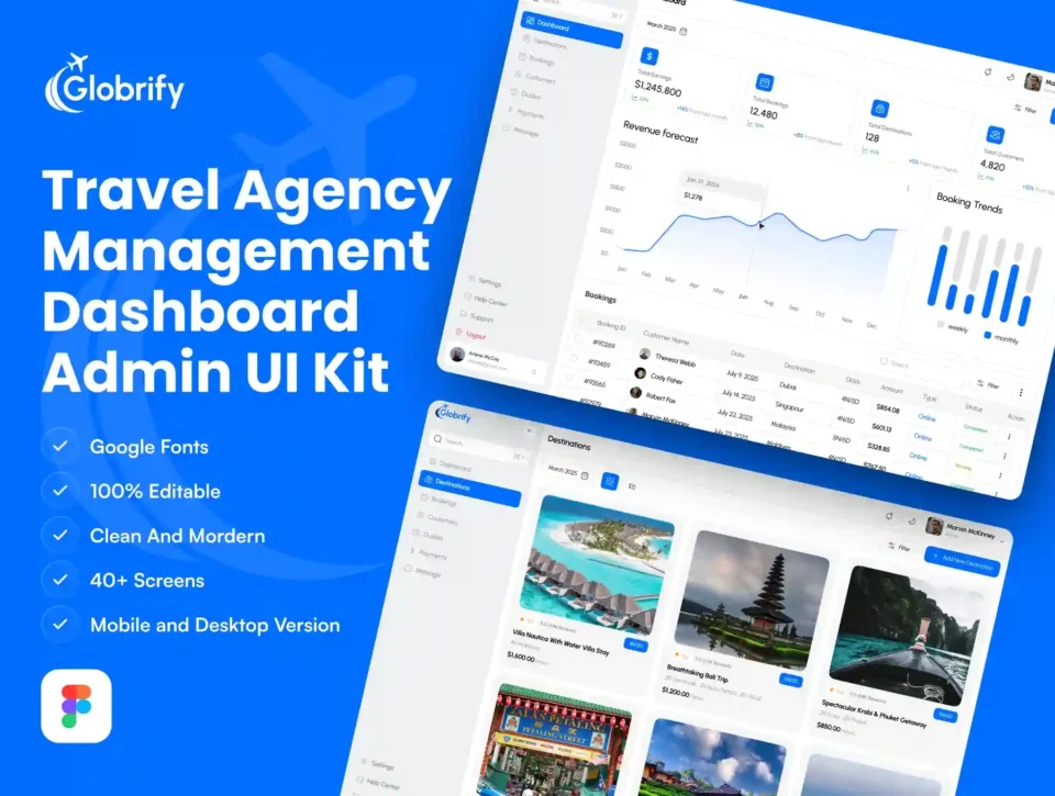 Globrify is a professional and modern Travel Agency Management Dashboard UI Kit designed to help agencies, tour operators, and travel startups manage their business with ease. Packed with clean layouts and powerful components, Globrify makes it simple to handle bookings, customer profiles, payments, massage, and analytics — all in one dashboard.
