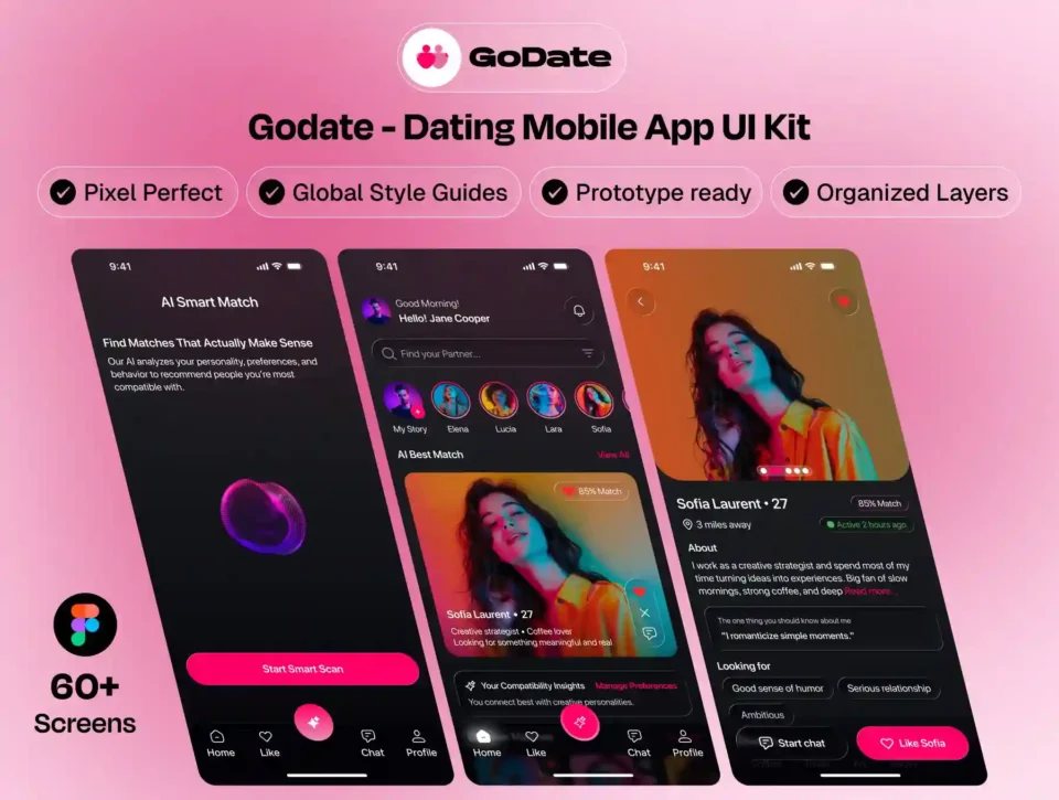 Design meaningful connections with style using Godate, a sleek and modern Dating Mobile App UI Kit built for relationship platforms, matchmaking startups, and social discovery apps.