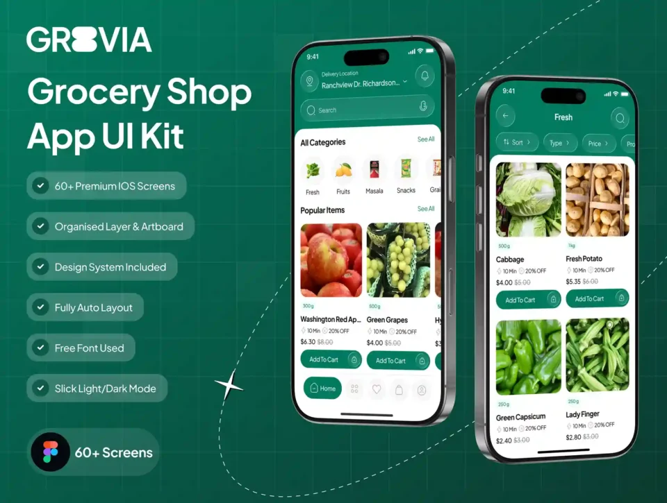 Introducing our Grocery Shop App UI Kit — a modern, fully customizable design system built in Figma with 60+ polished screens. Designed in both Light & Dark mode, this kit delivers a seamless shopping experience with clean layouts, smooth interactions, and pixel-perfect components. Perfect for crafting grocery apps with speed and style.