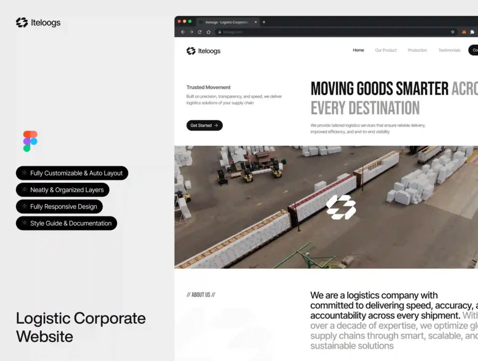 Iteloogs is a clean and modern landing page UI kit crafted for logistics, transportation, and supply chain companies that want to present their services in a clear and professional way. Designed in Figma with organized layers, auto layout, and reusable components, Iteloogs helps designers and teams quickly build a responsive corporate website that communicates reliability, efficiency, and operational strength.