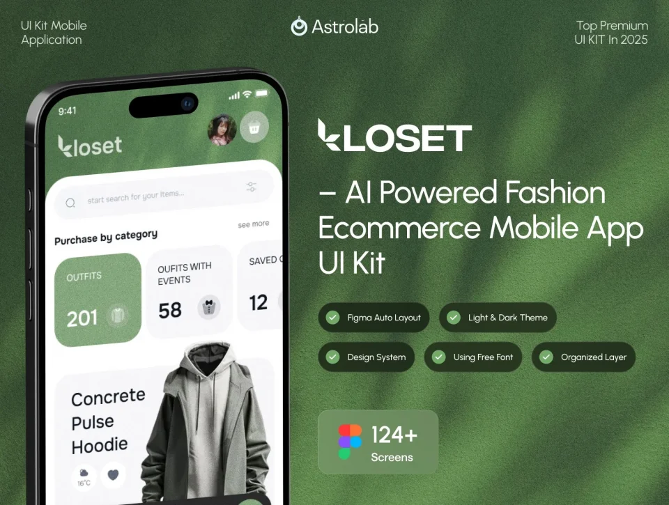 KLOSET is a premium, AI-powered fashion ecommerce mobile app UI kit designed for designers and developers building next-generation shopping experiences. With 124+ meticulously crafted screens, this kit eliminates the guesswork and accelerates your workflow with production-ready designs featuring innovative AI interactions and virtual try-on capabilities.