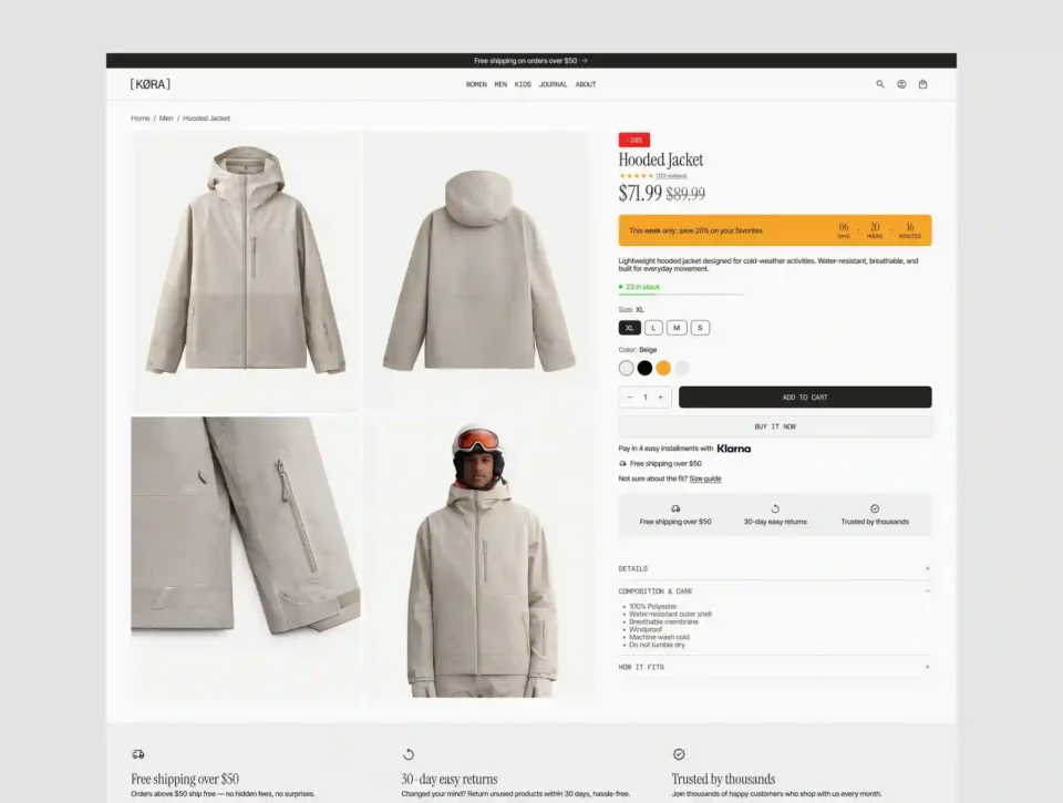 The system includes 205 fully designed screens across desktop, tablet, and mobile, covering the entire e-commerce flow — from discovery to checkout and post-purchase experience. Every layout is designed to be flexible, scalable, and easy to adapt to different fashion categories: apparel, accessories, essentials, and lifestyle products.