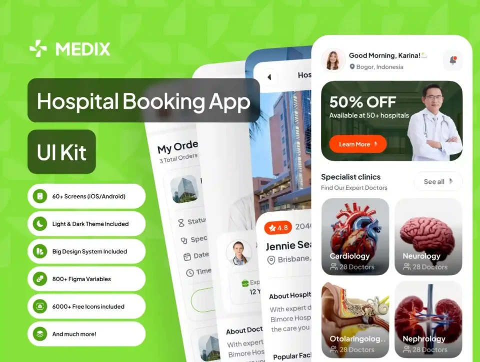 Medix – Hospital Booking App UI Kit is a complete design system built for healthcare and hospital applications. Designed in Figma, it comes with 60+ mobile screens for both iOS and Android, featuring Auto Layout 5.0, Light & Dark themes, and a fully scalable design system.