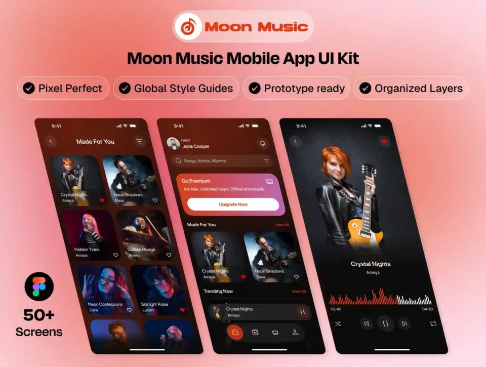 Moon Music is a modern and beautifully crafted mobile music streaming app UI kit designed for designers, startups, and developers who want to build music apps quickly.