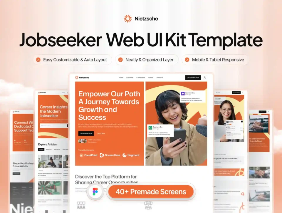 This comprehensive UI kit is crafted with a modern, clean, and trendy visual style, making it perfect for startups, recruitment platforms, HR tools, and career service websites. Every screen is thoughtfully designed to ensure clarity, usability, and a premium look.