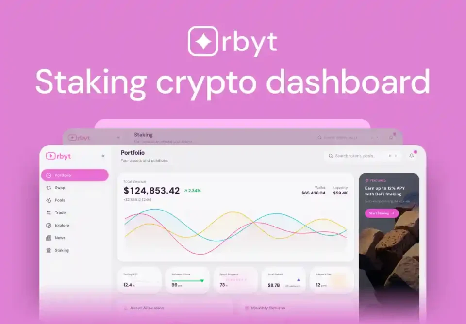 A premium, production-ready crypto dashboard built with glass morphism design language. Orbyt delivers screens covering every core flow of a modern staking and DeFi platform — from portfolio tracking to liquidity management.