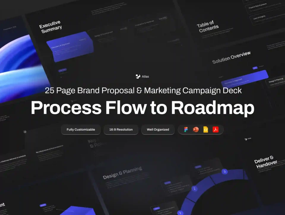 Elevate your presentations with Atlas, a cutting-edge Figma-powered pitch deck designed for marketing, business, and company. Featuring a sleek, minimalist aesthetic, this dynamic template is fully customizable with your brand colors, ensuring a professional and visually striking pitch every time.
