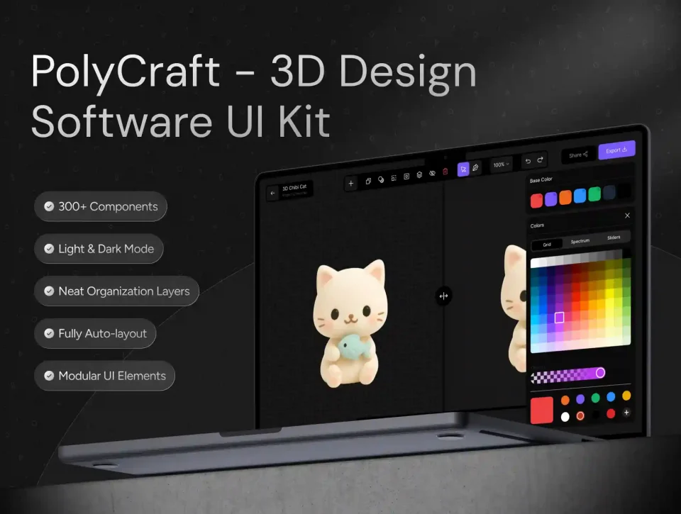 Introducing PolyCraft – 3D Customization Web Software UI Kit, a premium mobile design system crafted for 3D creation tools, AI-assisted modeling apps, and interactive customization experiences. With 51 unique screens across both light and dark mode, every interface is built with auto layout, a clean and logical structure, and a scalable component system to help you design faster and more consistently.