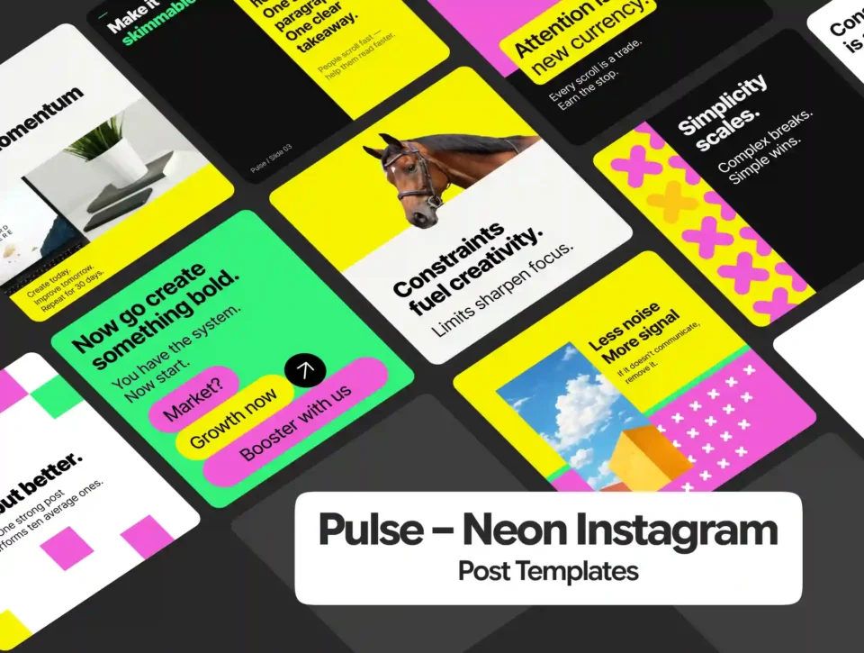 Create eye-catching Instagram content with this bold neon template pack designed for creators, brands, and marketers. Pulse is a collection of modern Instagram templates focused on strong typography, high contrast color combinations, and minimal layouts that maximize readability and visual impact.