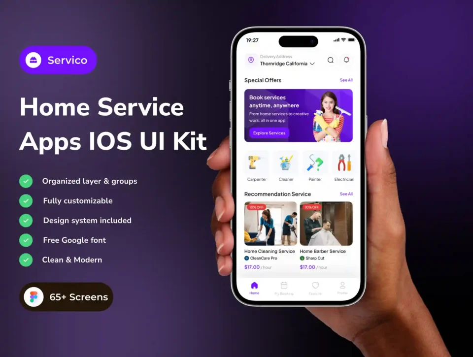 Servico is a comprehensive and intuitive UI kit designed for building modern home service and on-demand service apps on iOS. With over 65+ professionally crafted screens, Servico simplifies the process of creating a seamless, efficient, and visually engaging service booking experience.