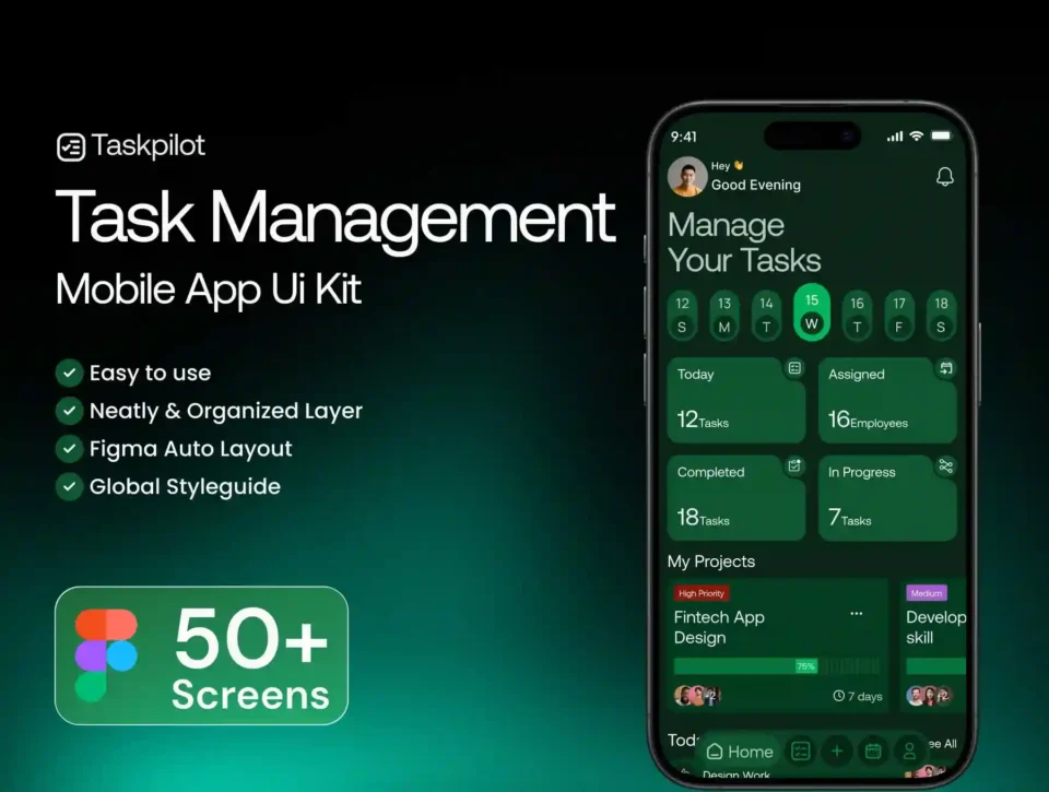 Taskpilot is a modern and productivity-focused Task Management Mobile App UI Kit designed to help teams, startups, and productivity platforms build efficient task and project management applications. With a clean layout, intuitive navigation, and a well-structured design system, Taskpilot makes it easy to create powerful task management experiences for mobile users.