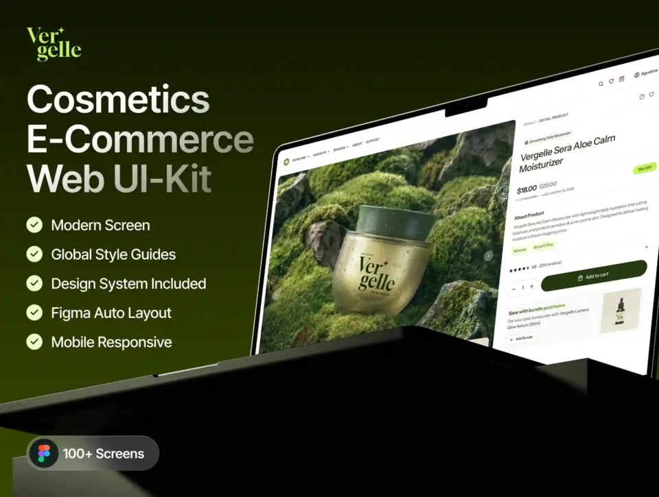 Vergelle – Cosmetic E-Commerce Web UI Kit is a modern and elegant UI kit designed for beauty brands, skincare stores, and cosmetic e-commerce platforms. With a clean layout, premium visual style, and carefully crafted components, Vergelle helps designers and startups build beautiful online stores faster and more efficiently.