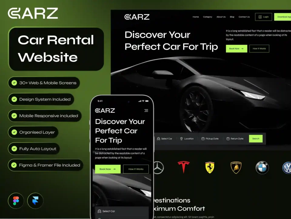CARZ – Car Rental Website Framer Template