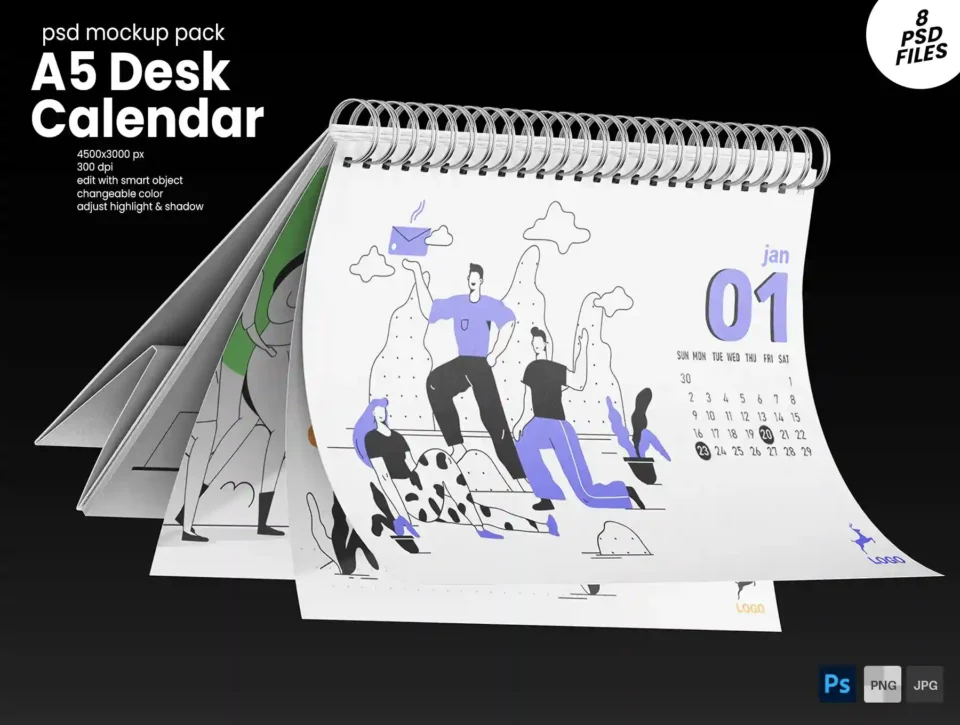 A5 Landscape Desk Calendar PSD Mockup Set