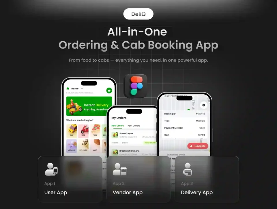 3 Apps | Ordering & cab Booking App | Figma | DeliQ